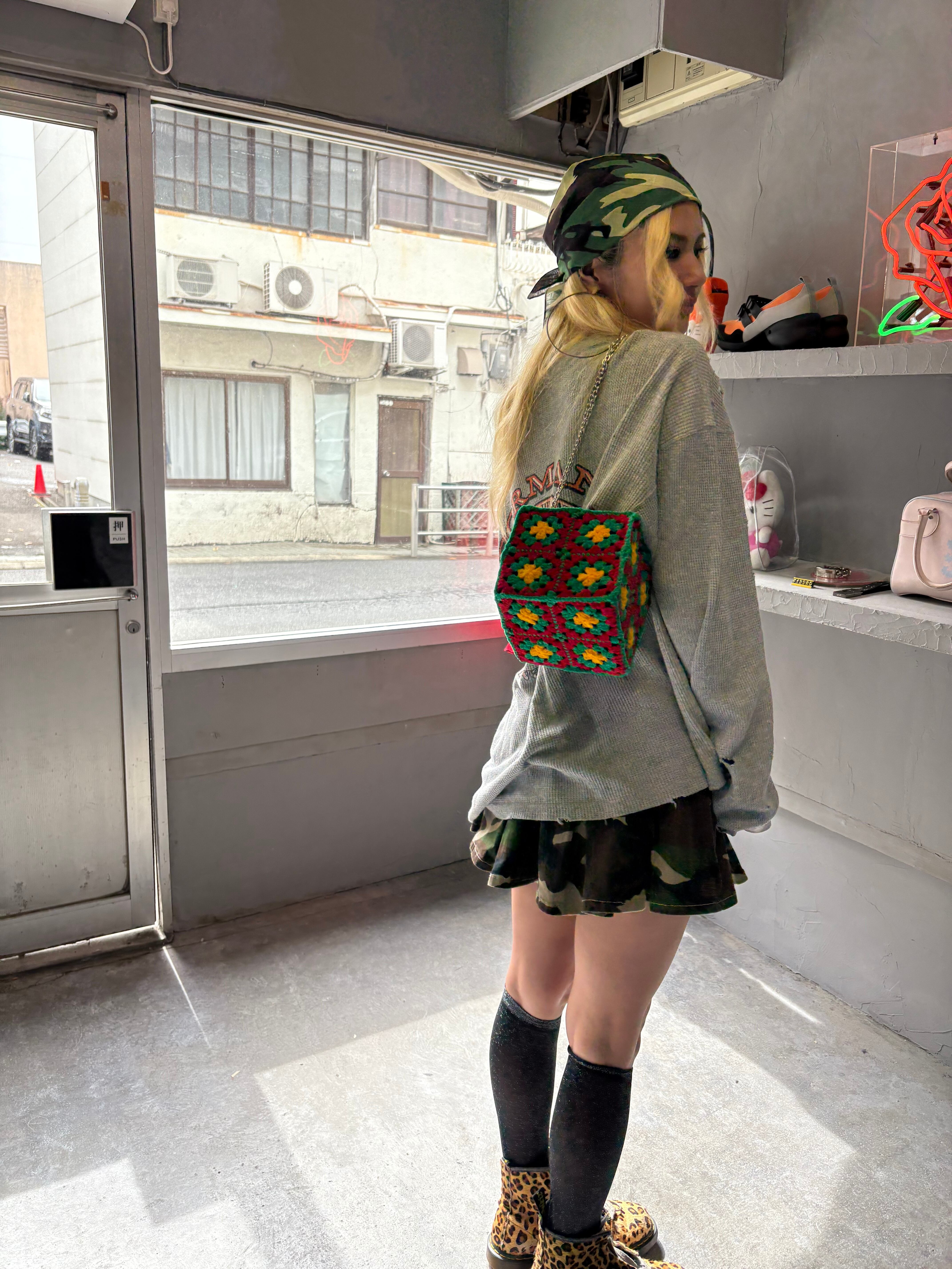 佐世保で人気の古着屋ドキドキ様とのコラボレーションバッグで、キューブの底にはドキドキのタグつきキューブバッグです。